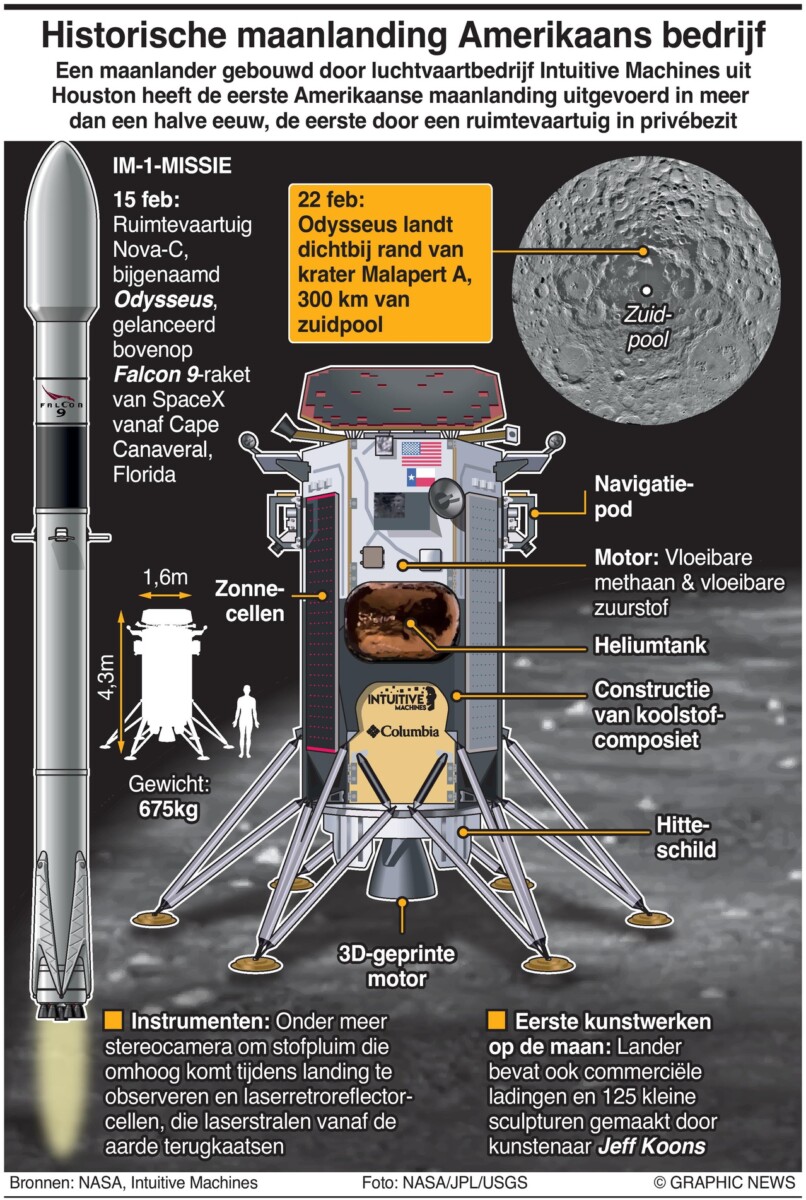 23 februari 2024 – Een maanlander gebouwd door lucht- en ruimtevaartbedrijf Intuitive Machines uit Houston heeft de eerste Amerikaanse maanlanding in meer dan een halve eeuw gemaakt en de eerste door een particulier ruimtevaartuig.