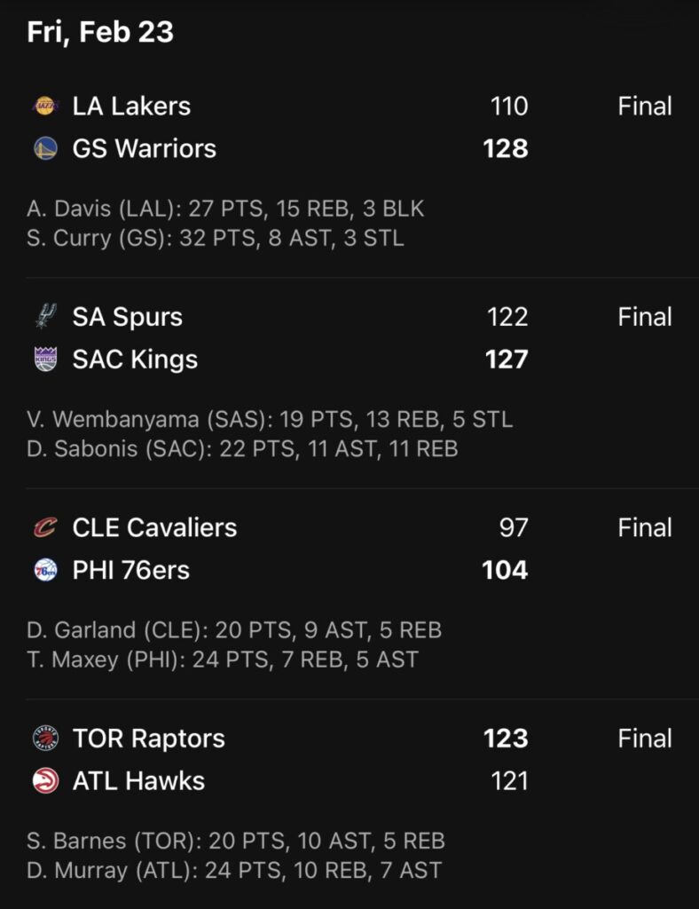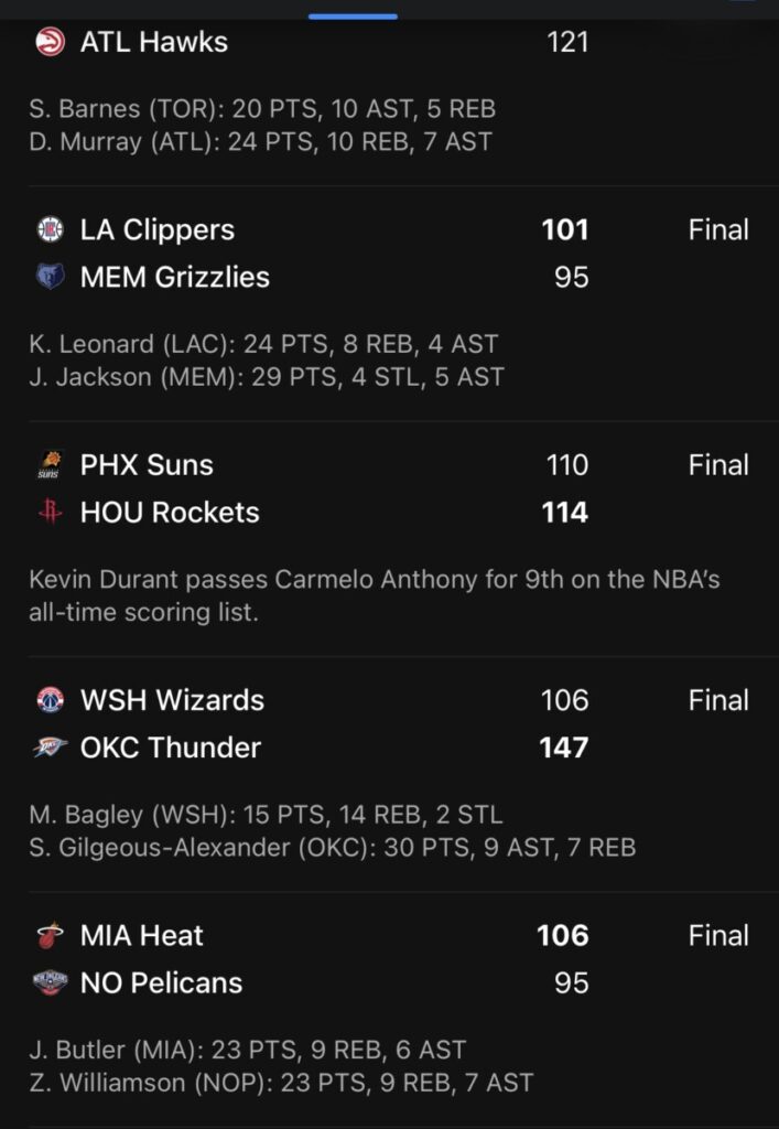 In andere NBA-actie, vestigde de Oklahoma City Thunder een seizoensrecord voor gescoorde punten in hun overwinning tegen de Washington Wizards. Golden State Warriors toonden defensieve kracht in hun zege op de Charlotte Hornets, terwijl de Los Angeles Lakers met succes langs de San Antonio Spurs zeilden. De Philadelphia 76ers herpakten zich van een verliesreeks met een zege op de Cleveland Cavaliers, en de Denver Nuggets domineerden de Portland Trail Blazers dankzij een sterke prestatie van Michael Porter Jr. en Nikola Jokic. De Houston Rockets sloten de nacht af met een nauwe overwinning op de Phoenix Suns, onder leiding van drie spelers met dubbeldubbels.