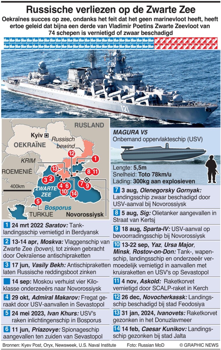 De vernietiging van het Russische landingsschip Caesar Kunikov op 14 februari markeert het recentste verlies, waardoor het aantal Russische oorlogsschepen en onderzeeërs dat is vernietigd of zwaar beschadigd, oploopt tot circa 21.