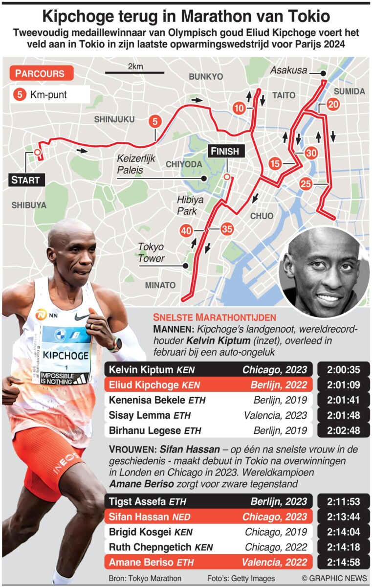 Tweevoudig Olympisch gouden medaillewinnaar Eliud Kipchoge is de headliner op het mannenveld in Tokio tijdens zijn laatste opwarmrace voor Parijs 2024. Kipchoge’s landgenoot, wereldrecordhouder Kelvin Kiptum, kwam in februari op tragische wijze om het leven bij een auto-ongeluk.