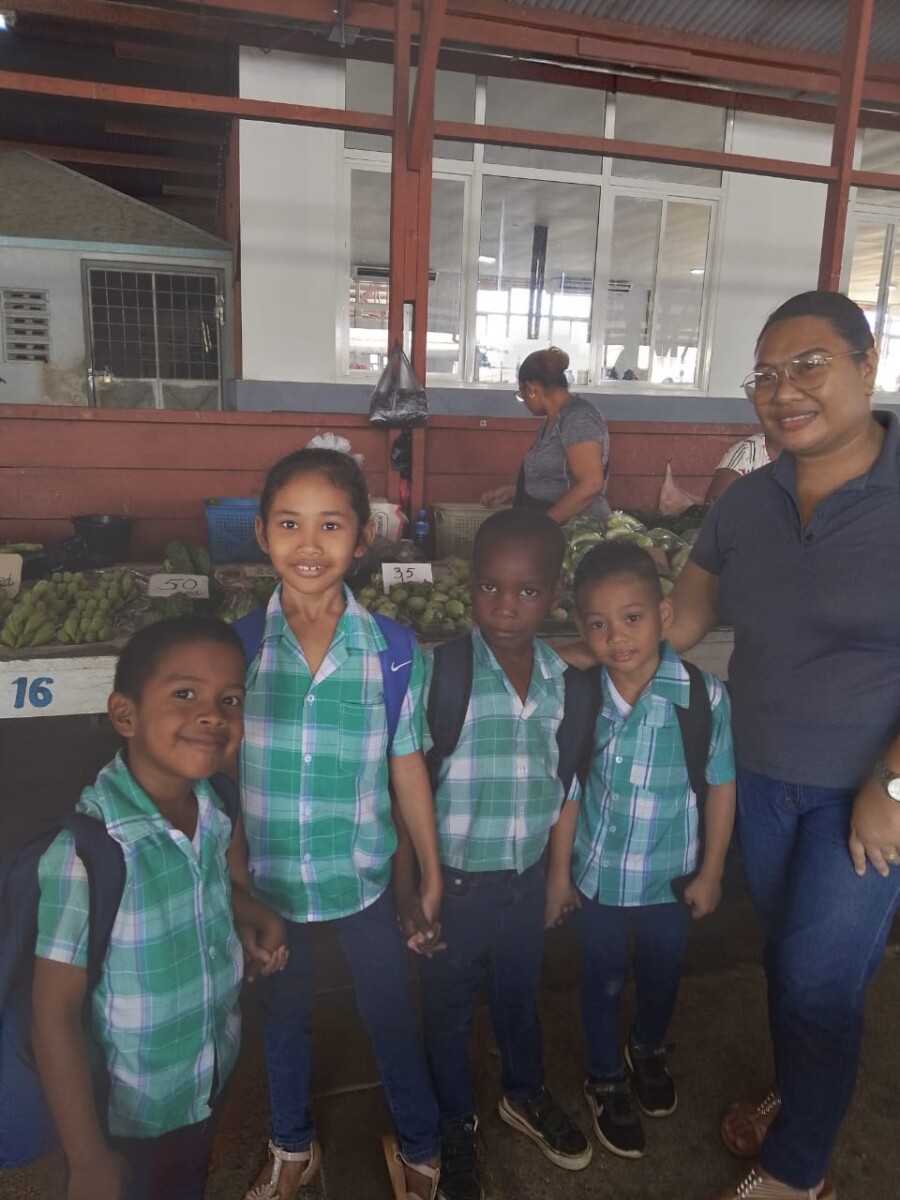 Een redactrice van Dagblad Suriname kwam afgelopen woensdag op de Kwatta Markt aan de Kwattaweg, waar verse groenten en vers vlees en vissoorten gekocht kunnen worden, een juf van O.S. Maho-Projekt in Saramacca tegen met een groep leerlingen.