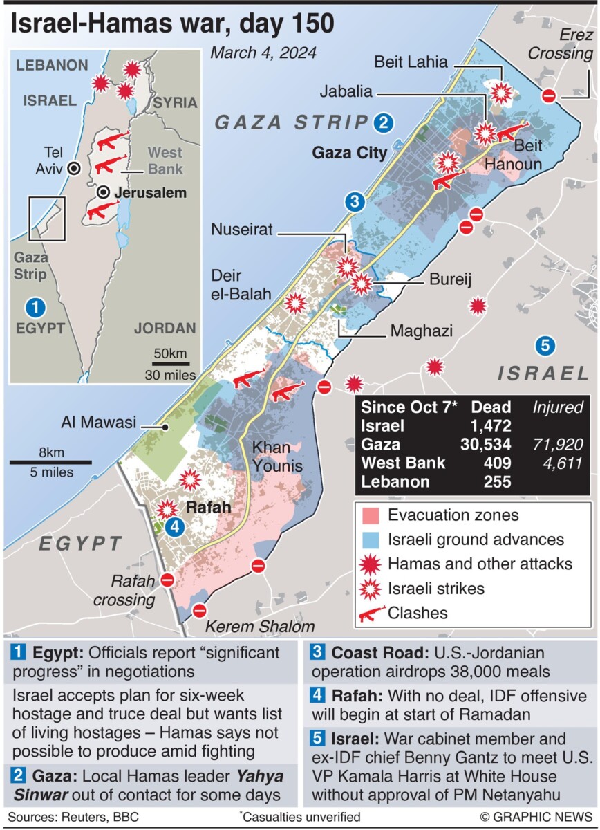 Hamas pleit voor een permanent staakt-het-vuren en de volledige terugtrekking van Israëlische troepen uit Gaza, maar wil intussen de vrijlating van honderden Palestijnse gevangenen in ruil voor de gijzelaars. Egyptische en Qatarese bemiddelaars doen intensieve inspanningen om een overeenkomst te bereiken voordat de heilige maand Ramadan begint op 10 maart. Israël heeft aangegeven dat als er tegen die tijd geen overeenkomst is, het een offensief zal beginnen op Rafah-stad, het laatste bolwerk van Hamas, maar nu ook de thuisbasis van ongeveer 1,4 miljoen mensen.