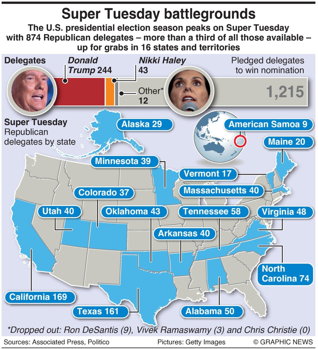 4 maart 2024 – Het hoogtepunt van het Amerikaanse presidentsverkiezingsseizoen vindt plaats op Super Tuesday, met 874 Republikeinse afgevaardigden — meer dan een derde van het totale aantal — die op het spel staan in 16 staten en territoria.