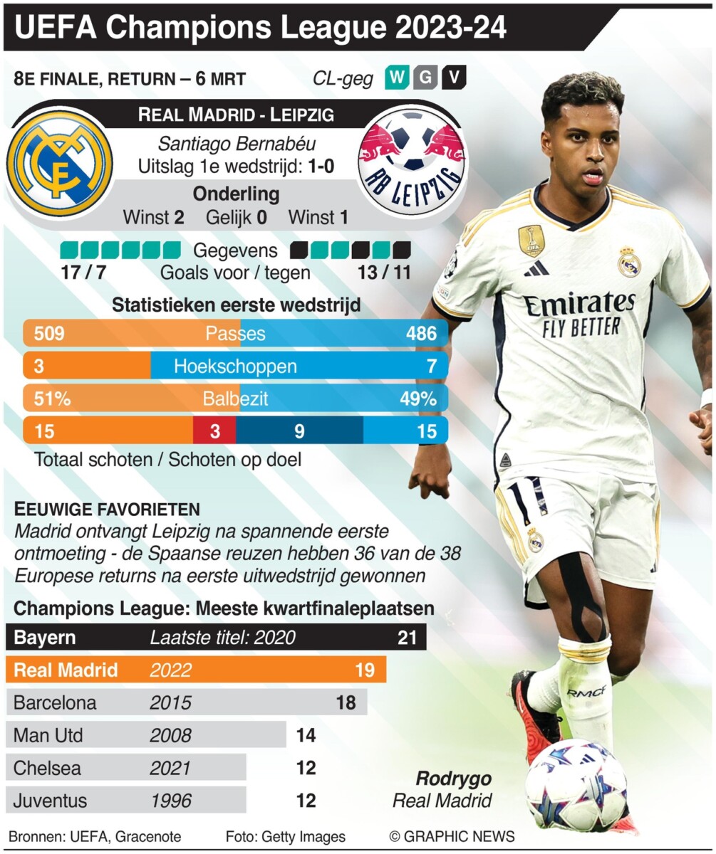 6 maart 2024 – In de tweede ronde van de achtste finales van de UEFA Champions League staan onder andere Real Madrid en RB Leipzig tegenover elkaar in het Santiago Bernabéu-stadion in Madrid. De loting voor de kwartfinales van de UEFA Champions League vindt plaats in Nyon, Zwitserland, op 15 maart.