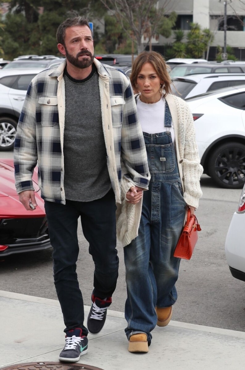 Toen zij zondag met echtgenoot Ben Affleck in Los Angeles was, zag de zangeres van “Can’t Get Enough” er moeiteloos cool uit in een oversized stonewash-denimoverall, gecombineerd met een wafelgebreid wit topje en een lang romig kabelgebreid vest. Ze hield de gezellige sfeer in stand met haar schoenen en koos voor wat lijkt op een karamelversie van de mini-platformlaarzen van Ugg, en droeg een kleine Hermès Birkin-tas met krokodillenreliëf in bloedsinaasappel.