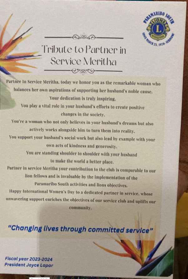 Onder hen was ook Meritha Vas-Moniz, als lady lions, die speciaal voor deze gelegenheid was uitgenodigd. De avond werd extra bijzonder gemaakt door Lion Joyce Lapar, de president van de club, die Vas-Moniz vereerde met een persoonlijk geschreven gedicht, aangeboden namens haar club.