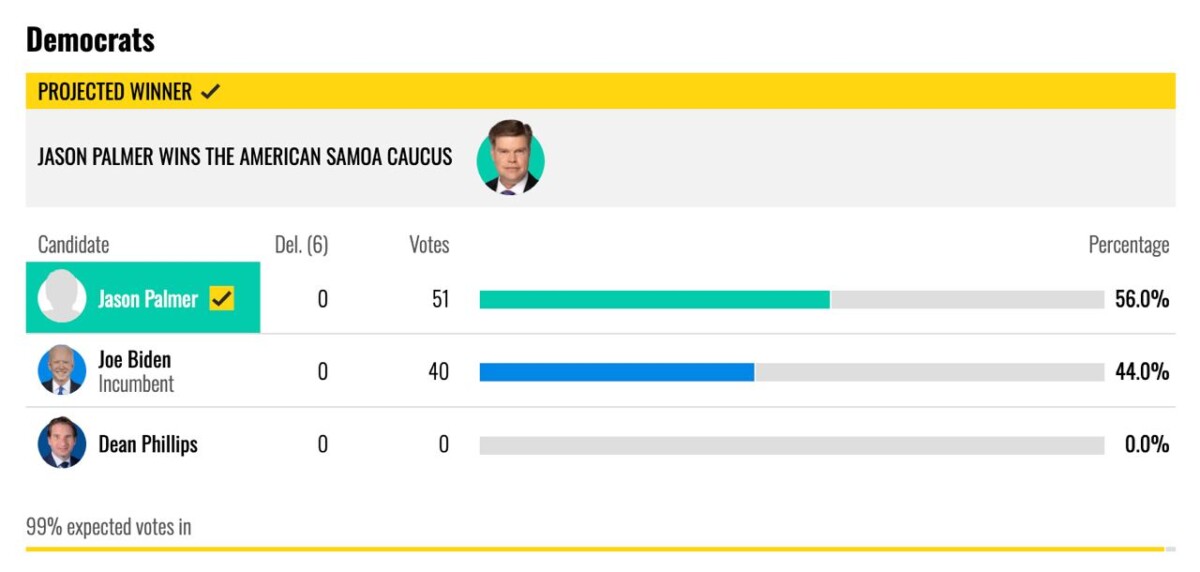 Biden heeft tot nu toe één enkele voorverkiezingen verloren, en dat was van de voorheen onbekende kandidaat Jason Palmer, die de president met een marge van elf stemmen achter zich liet.