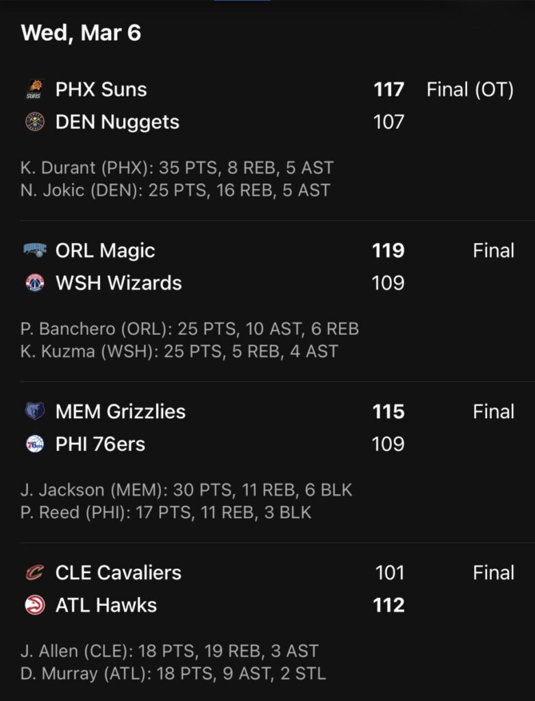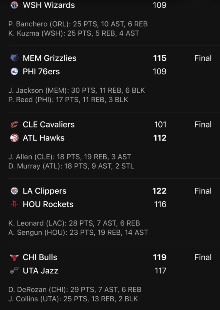 Andere opmerkelijke wedstrijden omvatten een overwinning van de Orlando Magic tegen de Washington Wizards, waarbij de Magic een tekort van 21 punten overbrugden voor een 119-109 overwinning. Deze nederlaag betekende de 16e opeenvolgende verliespartij voor de Wizards, een evenaring van hun franchise-record. De Chicago Bulls versloegen de Utah Jazz met 119-117 dankzij beslissende vrije worpen van DeMar DeRozan in de laatste seconden. Voorts boekten de Atlanta Hawks een overwinning op de Cleveland Cavaliers met 112-101, de Los Angeles Clippers kwamen terug van een achterstand van 20 punten om de Houston Rockets te verslaan met 122-116, en de Sacramento Kings wonnen van de Los Angeles Lakers met een score van 130-120, ondanks een vroege achterstand van 19 punten.