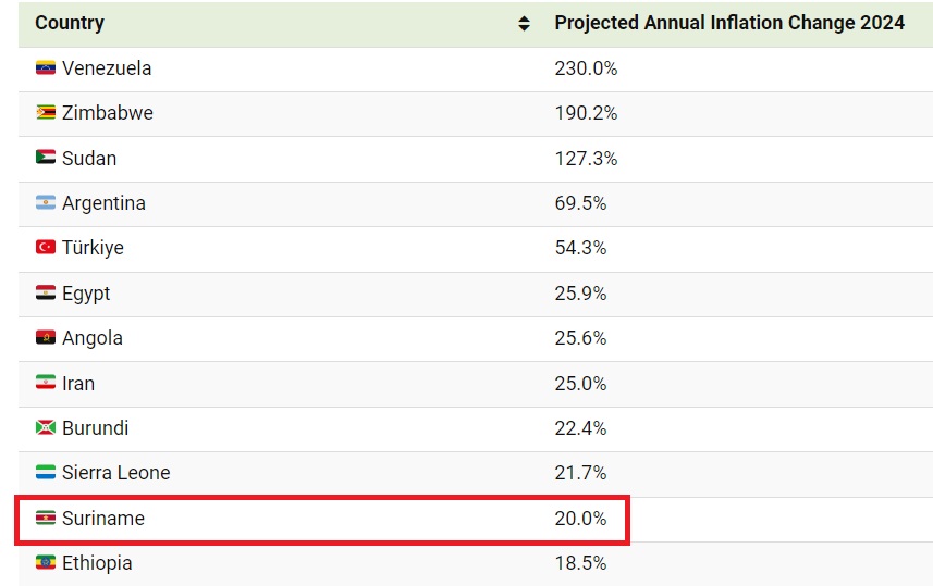 Suriname zal naar verwachting een jaarlijkse inflatie van 20% hebben in 2024. Dit brengt het uit de top 10 van de wereld. Volgens een lijst van ‘visualcapitalist’ gebaseerd op voorspellingen van het Internationaal Monetair Fonds (IMF) komt Suriname net buiten de top 10 op plek 11. Hoewel de inflatie lijkt af te nemen, blijft het risico bestaan van een tweede golf van prijsdruk in de wereld. In 2024 zal de mondiale inflatie naar verwachting dalen tot 5,8%, vergeleken met een geschat jaargemiddelde van 6,8% in 2023.