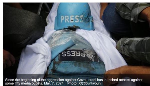 Sinds oktober 2023 heeft Israël 127 Palestijnse journalisten gedood en aanvallen uitgevoerd op ongeveer vijftig mediakanalen in de Gazastrook. Het Palestijnse Journalisten Syndicaat heeft bij de VN en internationale gemeenschap aangedrongen op bescherming voor de pers in Gaza. In februari werden elf journalisten gedood en meerdere verslaggevers raakten gewond of gearresteerd, en hun uitrusting werd in beslag genomen. Deze acties zijn bedoeld om de berichtgeving over de situatie in de bezette gebieden te onderdrukken, inclusief de aanvallen op mediabedrijven zoals Al Jazeera en Palestine TV.