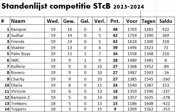 Donderdagavond werd de competitie van de Surinaamse Troefcallbond (STcB) voortgezet in Court Charity. Sudhar en Friends maakten geen fouten en houden de druk op koploper Kampoe.