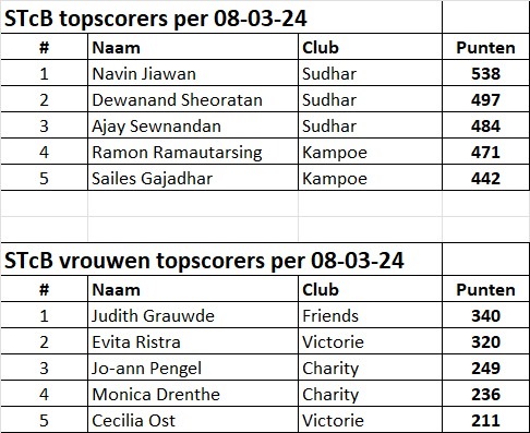 Hoogste score Sudhar: Kishoor Biharie – Vikash Mathoera 23 punten