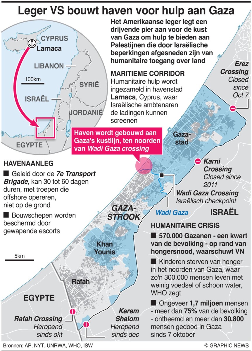 De haven, die aan de kustlijn van Gaza, ten noorden van de Wadi Gaza Crossing, zal worden gebouwd, kan 30 tot 60 dagen in beslag nemen, terwijl troepen offshore opereren, in overeenstemming met het mandaat van president Biden dat er geen Amerikaanse soldaten ter plaatse in Gaza zijn terwijl het conflict woedt.