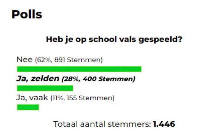 Uitgevoerd door Dagblad Suriname, biedt een recente online peiling enig inzicht in de prevalentie van vals spel onder studenten. Met een totaal van 1446 respondenten geeft de meerderheid, 62%, oftewel 891 stemmen, aan nooit vals te hebben gespeeld op school.