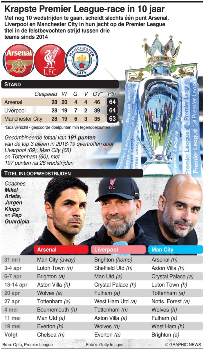 31 maart 2024 – 19 mei 2024 – Het 32e Premier League-seizoen gaat door, met nog 10 wedstrijden te gaan, slechts één punt scheidt Arsenal, Liverpool en Manchester City terwijl ze de Premier League-titel najagen in de meest felbevochten strijd tussen drie teams sinds 2014.