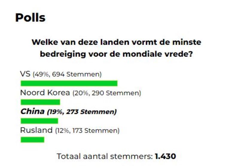 In een recente online peiling van Dagblad Suriname werd lezers gevraagd welk land zij zien als de minste bedreiging voor de mondiale vrede. De resultaten zijn opmerkelijk en geven veel stof tot nadenken over de huidige geopolitieke percepties.