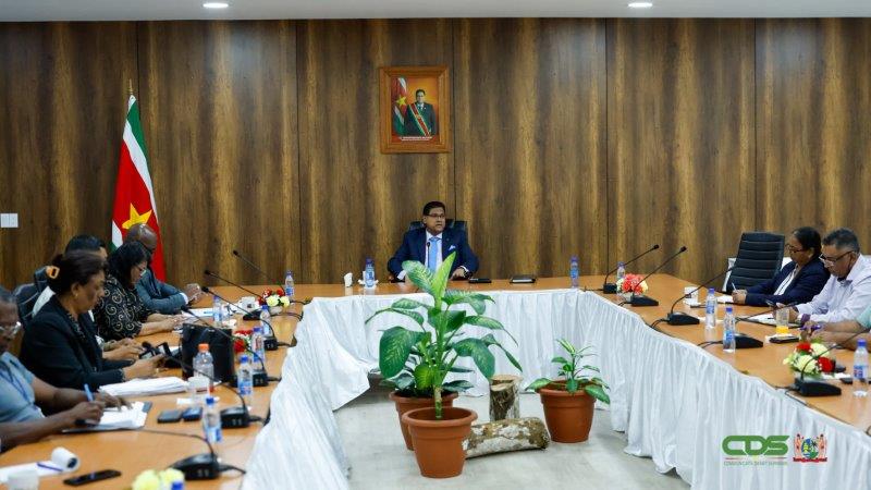 President Chandrikapersad Santokhi heeft maandag 11 maart met onder andere de ministers Kenneth Amoksi van Justitie en Politie (JusPol) en Krishna Mathoera van Defensie, directeur Vijay Chotkan van NV Luchthavenbeheer, de leiding van het Korps Politie Suriname (KPS), de Douane, het Directoraat Nationale Veiligheid (DNV) en een vertegenwoordiger van het Openbaar Ministerie van gedachten gewisseld over hoe de drugsbestrijding effectief op kan worden opgevoerd.