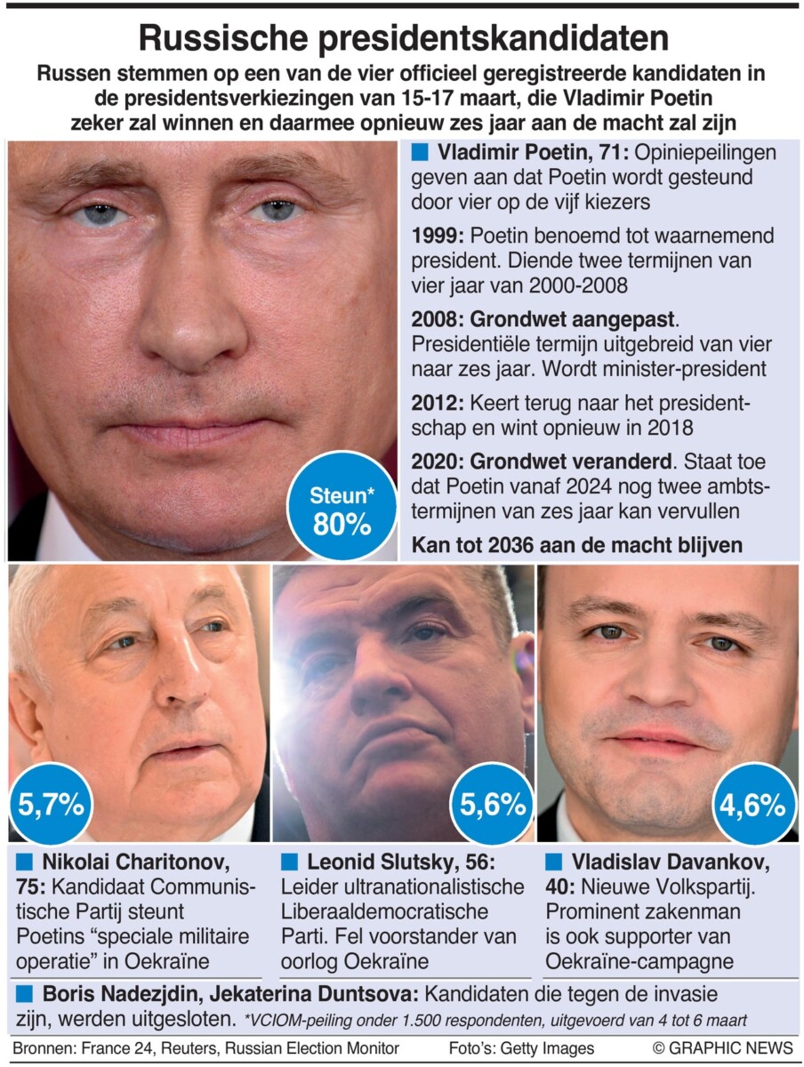 Behalve Poetin zijn er drie geregistreerde kandidaten: de nationalistische conservatieve Leonid Slutsky, de kandidaat van de Communistische Partij Nikolai Kharitonov en de zakenman Vladislav Davankov. Ze steunen allemaal de invasie van Poetin in Oekraïne.