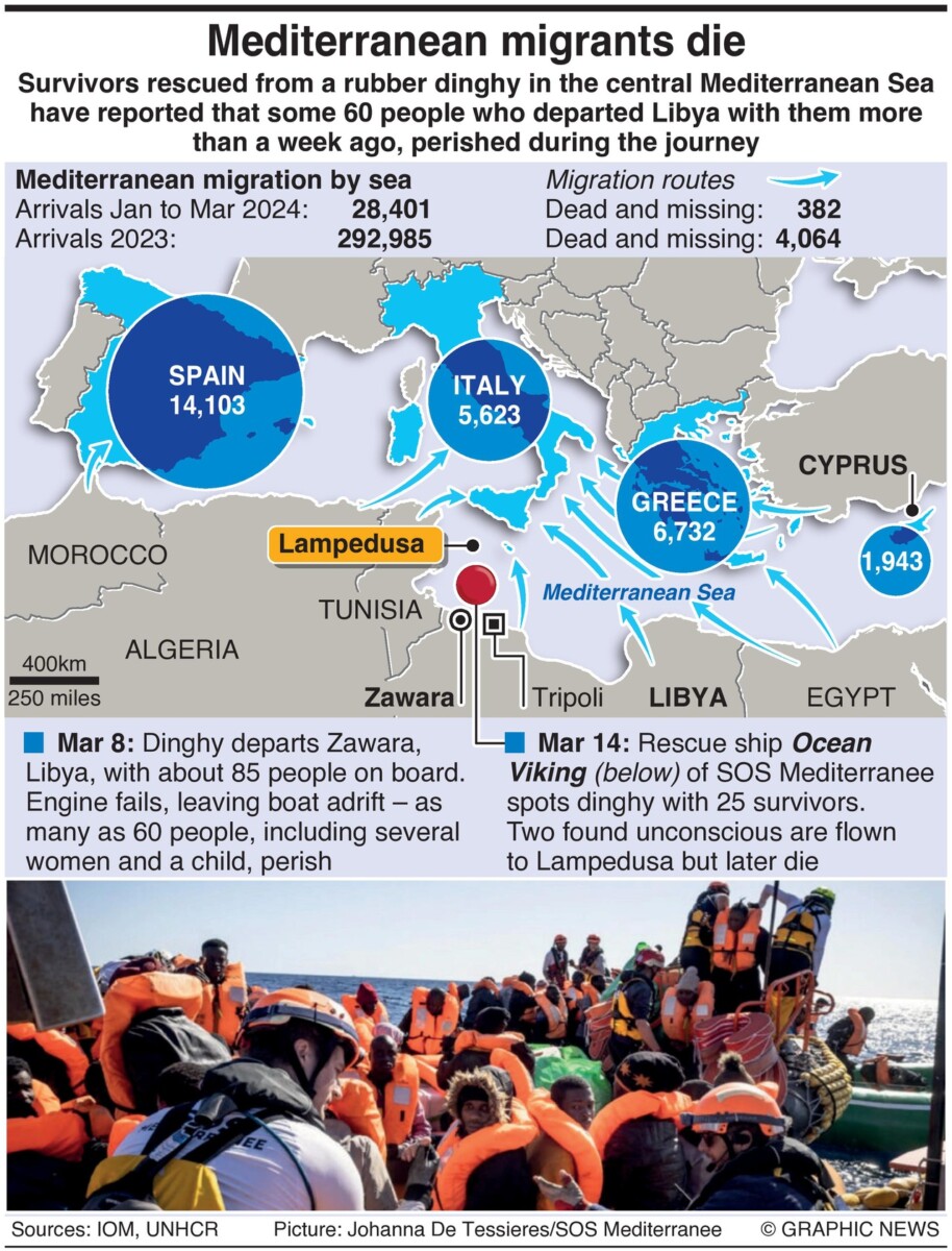 March 15, 2024 – Overlevenden die uit een rubberboot in de centrale Middellandse Zee zijn gered, hebben gemeld dat ongeveer 60 mensen die ruim een week geleden met hen uit Libië vertrokken, tijdens de reis zijn omgekomen.
