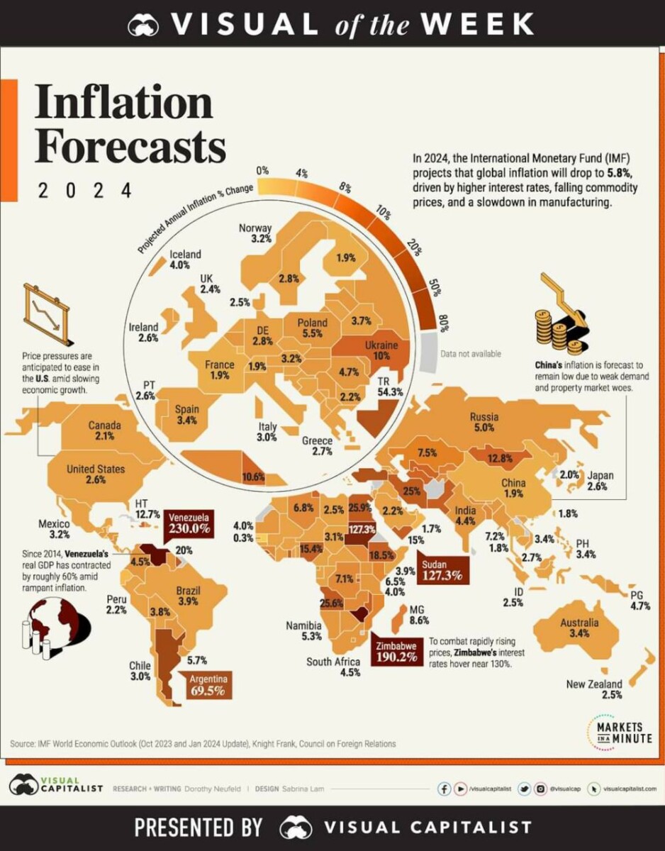In 2024 zal de mondiale inflatie naar verwachting dalen tot 5,8%, vergeleken met een geschat jaargemiddelde van 6,8% in 2023.