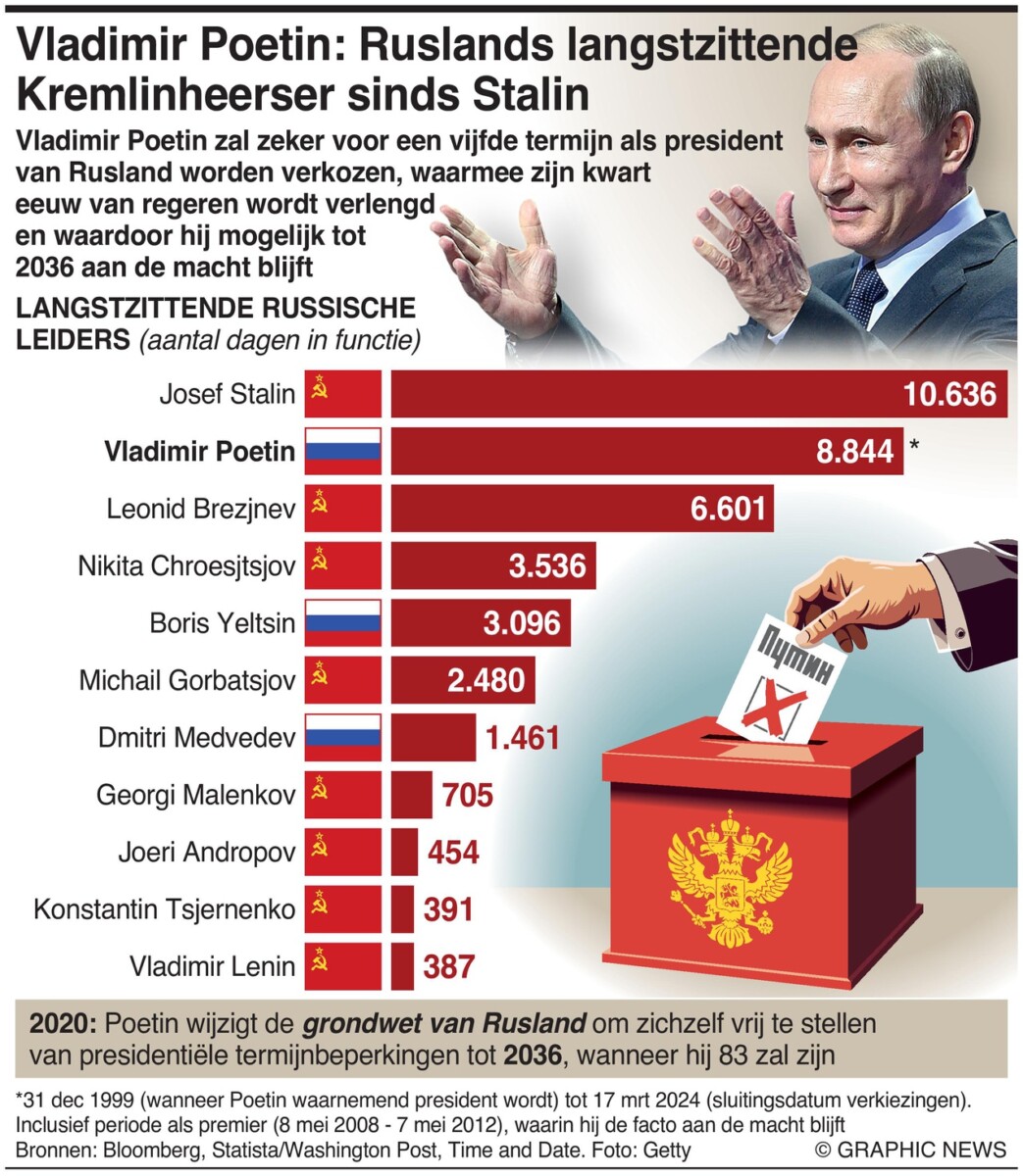 Poetin is de langst dienende leider van het Kremlin in Rusland sinds dictator Jozef Stalin uit het Sovjettijdperk, die 10.636 dagen aan de macht was – Poetin heeft 8.844 dagen gediend, vanaf 17 maart 2024, wanneer de stemhokjes sluiten.