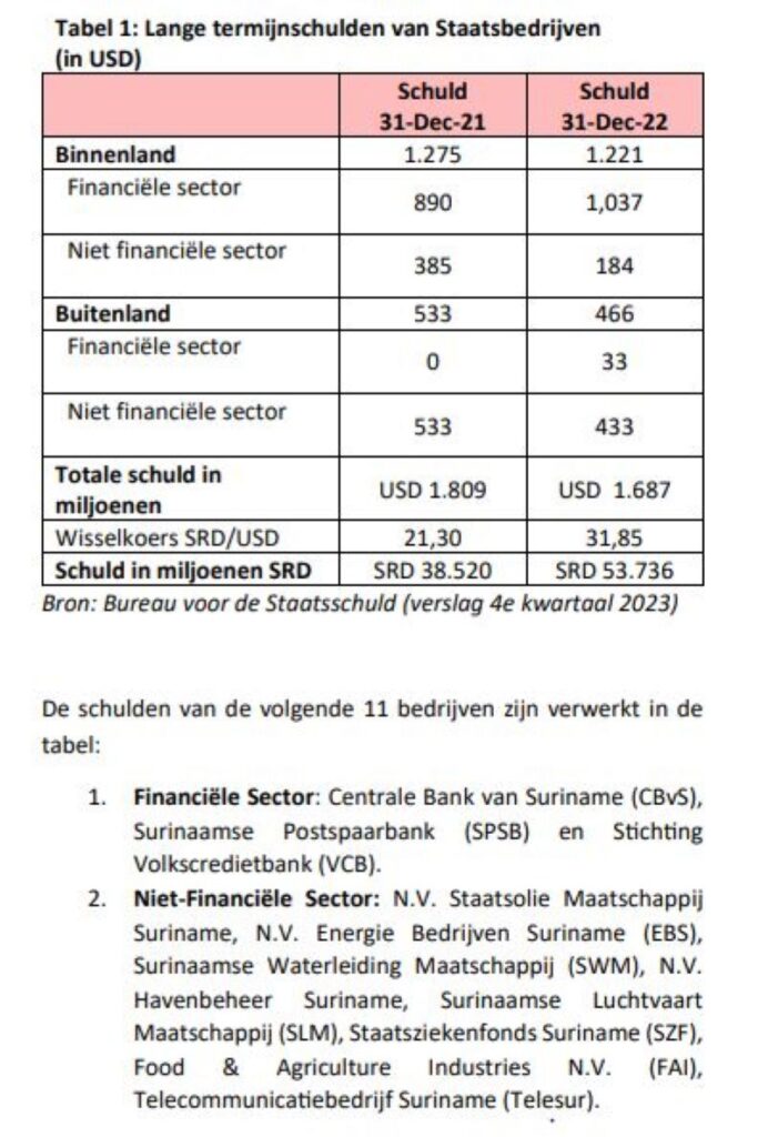 Uit recent onderzoek van het Bureau voor de Staatsschuld blijkt dat de totale lange termijnschuld van 11 Surinaamse staatsbedrijven eind 2022 is opgelopen tot maar liefst USD 1,7 miljard (omgerekend SRD 53,7 miljard), inclusief USD 126 miljoen aan achterstallige betalingen.