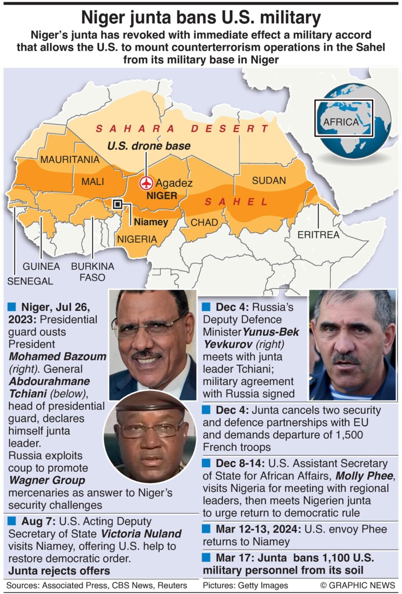 De toekomst van Amerikaanse terrorismebestrijdingsoperaties in de Sahel-regio staat op losse schroeven nadat de junta in Niger aankondigde de langdurige militaire samenwerking met de Verenigde Staten te beëindigen. De aankondiging volgde na een bezoek van hoge Amerikaanse functionarissen aan Niger. De VS heeft honderden troepen gestationeerd op een luchtmachtbasis in Niger voor vluchten boven de Sahel, waar jihadistische groepen actief zijn. De recente coup in Niger en de vraag aan Franse troepen om te vertrekken, markeert een dramatische verandering in de regio waarmee de Westerse landen konden samenwerken tegen jihadistische opstanden. De situatie wordt gecompliceerd door toenemende banden tussen lokale regeringen en Rusland, waaronder hulp van de Russische huurlingengroep Wagner. Dit incident toont de afnemende Amerikaanse invloed in de regio en benadrukt de noodzaak voor de VS om hun diplomatieke aanpak in de hele regio te heroverwegen.