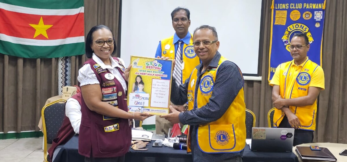 De voorzitter van de Stop Pesten-commissie, Lion Nasser Dahoe, overhandigde het eerste exemplaar van de poster namens Lions Club Parwani aan de District Governor. De President van Lions Club Parwani ,Soebhas Loetawan, benadrukte het wereldwijde karakter van pesten en de noodzaak van collectieve inspanningen om het probleem aan te pakken.