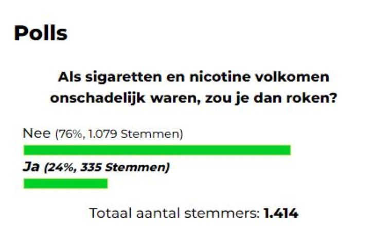 Uit een recente webpeiling van Dagblad Suriname blijkt, dat de meerderheid van de respondenten, ongeveer 76% ofwel 1.079 stemmen, aangeeft niet te zullen roken, zelfs als sigaretten en nicotine volledig onschadelijk zouden zijn.