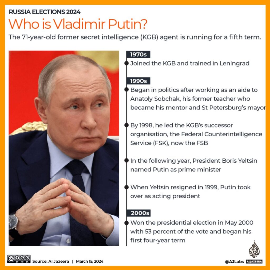 De Russische president Vladimir Poetin heeft in zijn overwinningstoespraak op 18 maart 2024 de Russische veerkracht tegen intimidatie benadrukt, na een verkiezing die hem op weg heeft gezet om de langst dienende leider van het land te worden sinds Catharina de Grote. Ondanks dat hij geen noemenswaardige tegenstand ondervond als gevolg van de gevangenneming, dood of verbanning van grote rivalen, en te midden van verscherpt toezicht op de militaire acties in Oekraïne, vierde Poetin een overweldigende verkiezingsoverwinning met 87,28% van de stemmen.