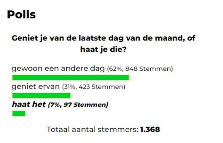 Let op: De resultaten van de peilingen op deze website zijn louter ter informatie en reflecteren de mening van de deelnemers. Ze zijn niet representatief voor de gehele bevolking en kunnen beïnvloed worden door externe factoren. Gebruik deze resultaten daarom met de nodige voorzichtigheid en neem ze niet als absolute waarheid.