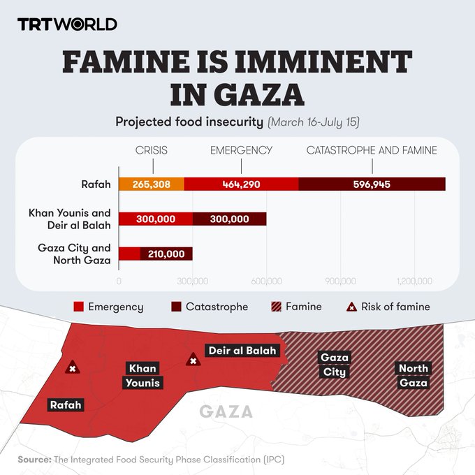 Hongersnood dreigt over de bevolking van Gaza nu de helft van de 2,3 miljoen inwoners van de belegerde enclave ‘catastrofale’ honger ervaart als gevolg van Israëlische bombardementen op landbouwgronden en het blokkeren van humanitaire hulp.