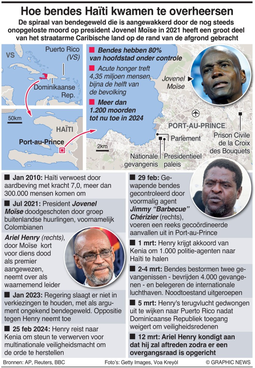 Haïti is sinds de moord op president Jovenel Moise in 2021 verwikkeld in geweld, waarbij straatbendes zich bezighouden met ontvoeringen en moorden terwijl ze grote delen van het land overnemen.