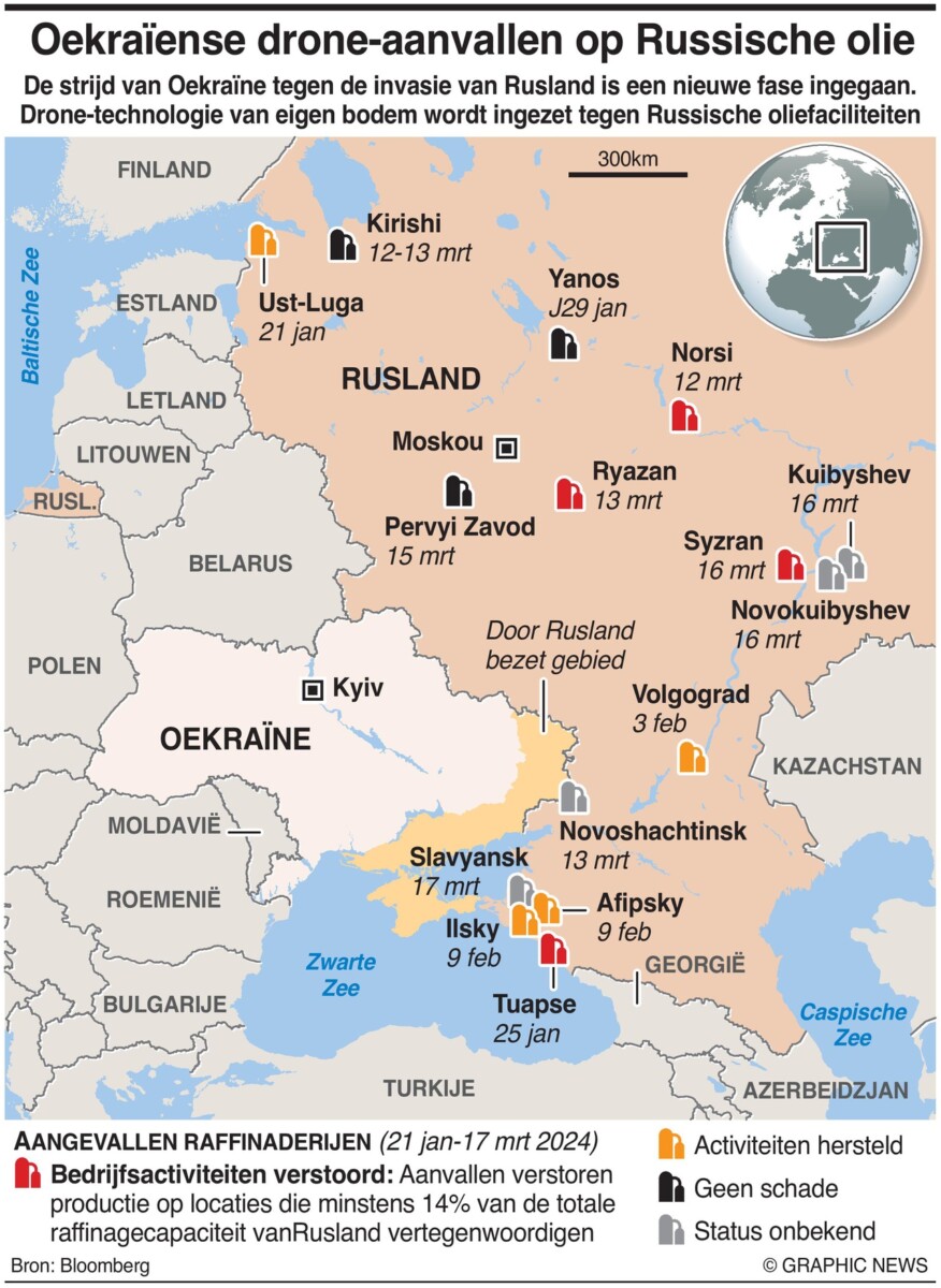 March 20, 2024 – De strijd van Oekraïne tegen de Russische invasie is een nieuwe fase ingegaan, waarbij dronetechnologie van eigen bodem het moet opnemen tegen een hele reeks oliefaciliteiten die grotendeels uit het Sovjettijdperk stamden.
