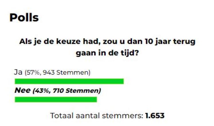 Let op: De resultaten van de peilingen op deze website zijn louter ter informatie en reflecteren de mening van de deelnemers. Ze zijn niet representatief voor de gehele bevolking en kunnen beïnvloed worden door externe factoren. Gebruik deze resultaten daarom met de nodige voorzichtigheid en neem ze niet als absolute waarheid.