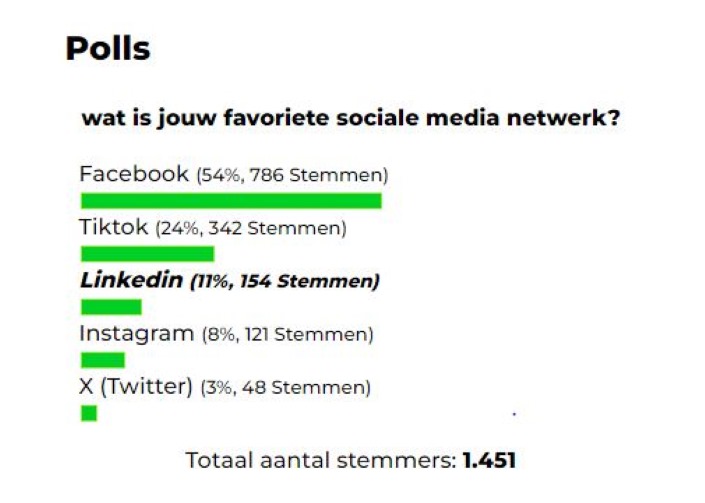 LinkedIn en Instagram volgen op respectabele afstand met respectievelijk 11% (154 stemmen) en 8% (121 stemmen). X, voorheen bekend als Twitter, en TikTok sluiten de ranglijst af met 3% (48 stemmen) en 24% (342 stemmen).