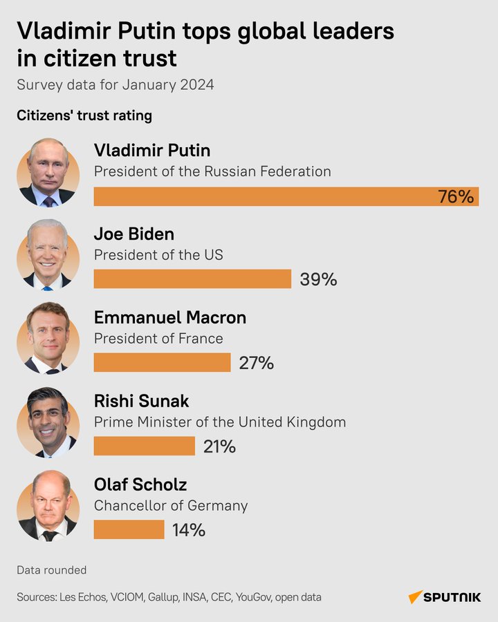 Relevante gegevens suggereren dat Vladimir Poetin de andere grote wereldleiders overtreft als het gaat om het vertrouwen van burgers. De Russische president geniet een algemene vertrouwensscore van 76 procent, een duizelingwekkend aantal vergeleken met zijn westerse tegenhangers.