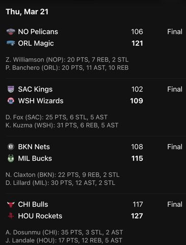 Op 22 maart 2024 boekten de Houston Rockets hun zevende overwinning op rij door met 127-117 te winnen van de Chicago Bulls. Jalen Green schitterde met 26 punten, terwijl Dillon Brooks 23 punten bijdroeg. Vanaf de bank zorgden Jock Landale (17 punten, 12 rebounds), Aaron Holiday (15 punten) en Jeff Green (14 punten, 7 rebounds) voor belangrijke bijdragen.