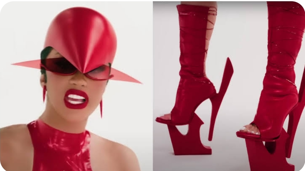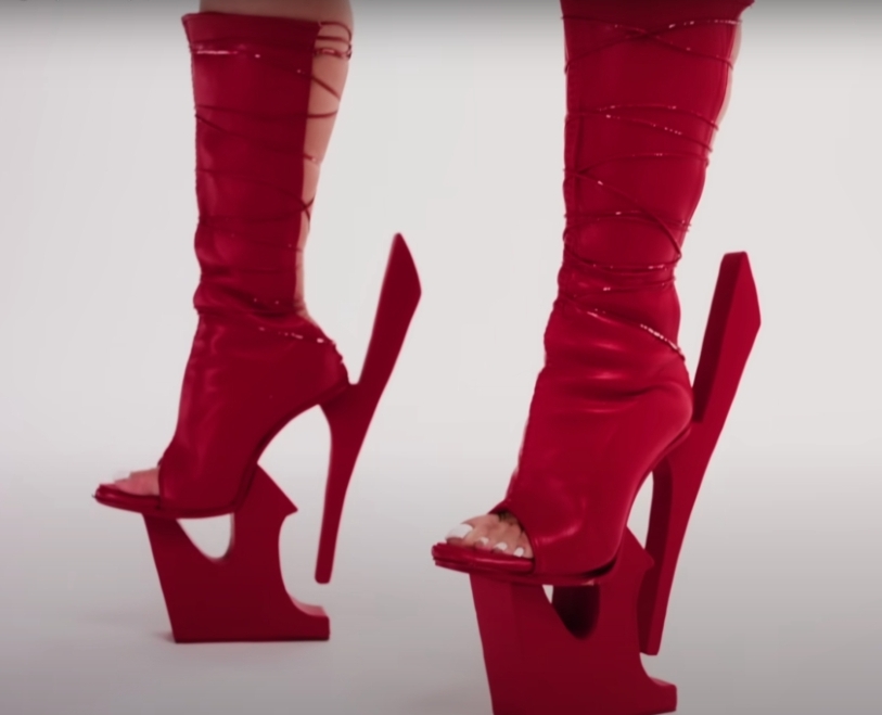De peep-toe-laarzen hebben een uitgebreide stijl. Ze zijn gemaakt van rood leer en hebben een voorpaneel dat tot aan het scheenbeen van Cardi B reikt, maar aan de achterkant met veters. Het platform is sculpturaal, met een uitsparing onder het teenbed van het schoeisel en een ander stuk dat uit de verhoogde hiel komt.