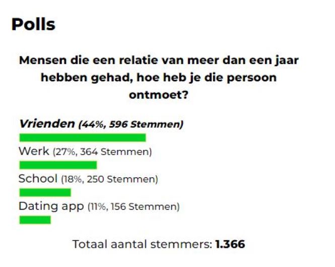 In de poll werd gevraagd aan mensen die een relatie van meer dan een jaar hebben, hoe zij hun partner ontmoet hebben. Onder de respondenten kozen de meesten (44%, 596 stemmen) voor ‘vrienden’ als hun ontmoetingspunt, gevolgd door ‘werk’ met 27% (364 stemmen) van de stemmen. ‘School’ werd gekozen door 18% van de deelnemers.