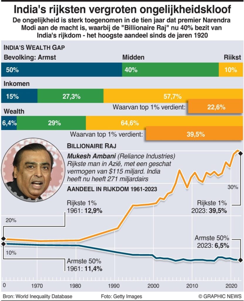 March 26, 2024 – De āmiljardair Rajā onder premier Narendra Modi is nu ongelijker dan de Britse Raj onder koloniale bezetting, toen ongeveer 50% van het inkomen naar de rijkste 10% van de bevolking ging.