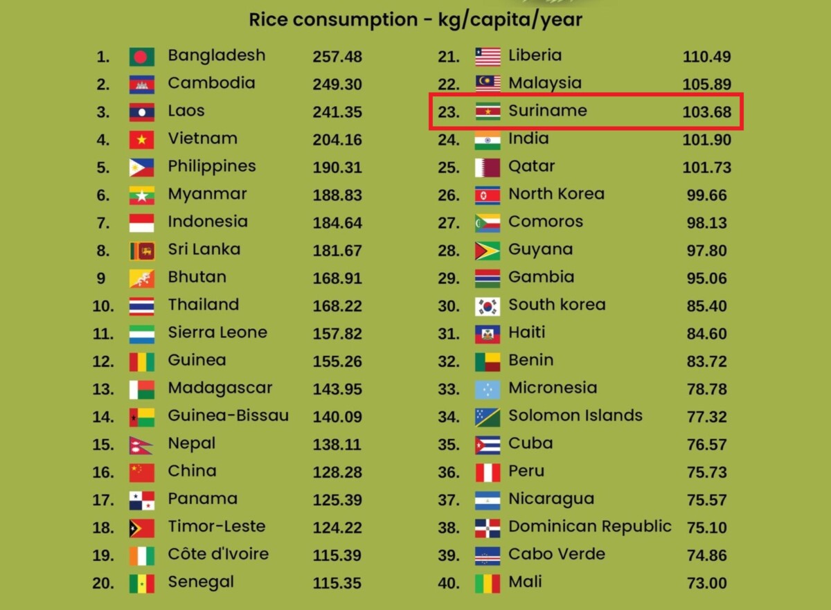 Surinamers eten veel rijst. Alhoewel dit algemeen bekend is blijkt uit recente indexen dat Surinamers in de top van de wereld zijn. Diverse rangschikkingen plaatsen Suriname in de top 25 van de rijst consumptie per hoofd van de bevolking. Voor Surinamers is dat zo’n 104 kilogram rijst per persoon per jaar.