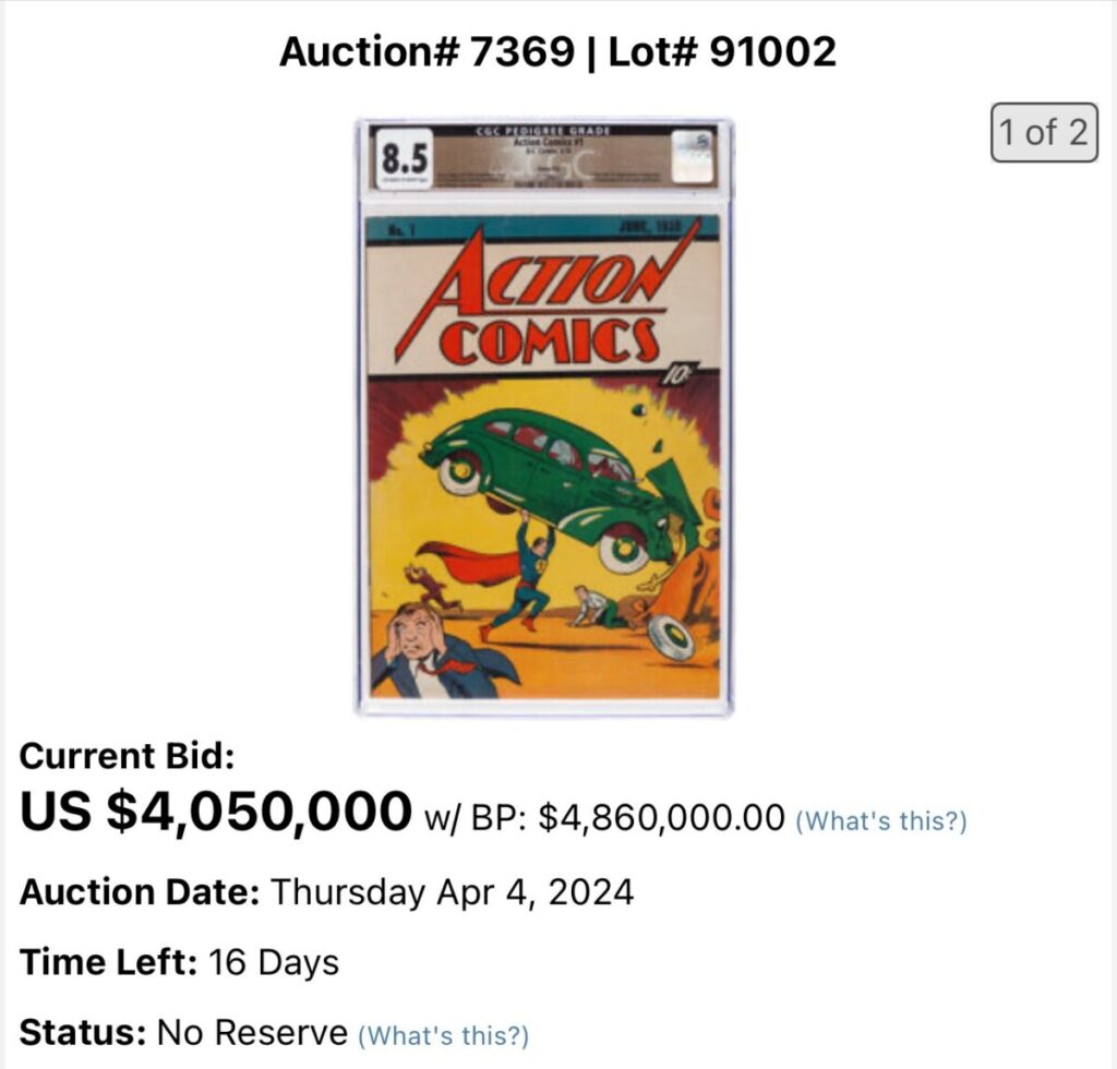 Het stripboek heet officieel Action Comics, uitgave 1. Volgens de veilingmeester is het een uniek exemplaar, met heldere kleuren en amper beschadigingen. Hij stelt zelfs dat het stripboek de zogeheten ‘gouden eeuw van stripboeken’ mogelijk maakte.