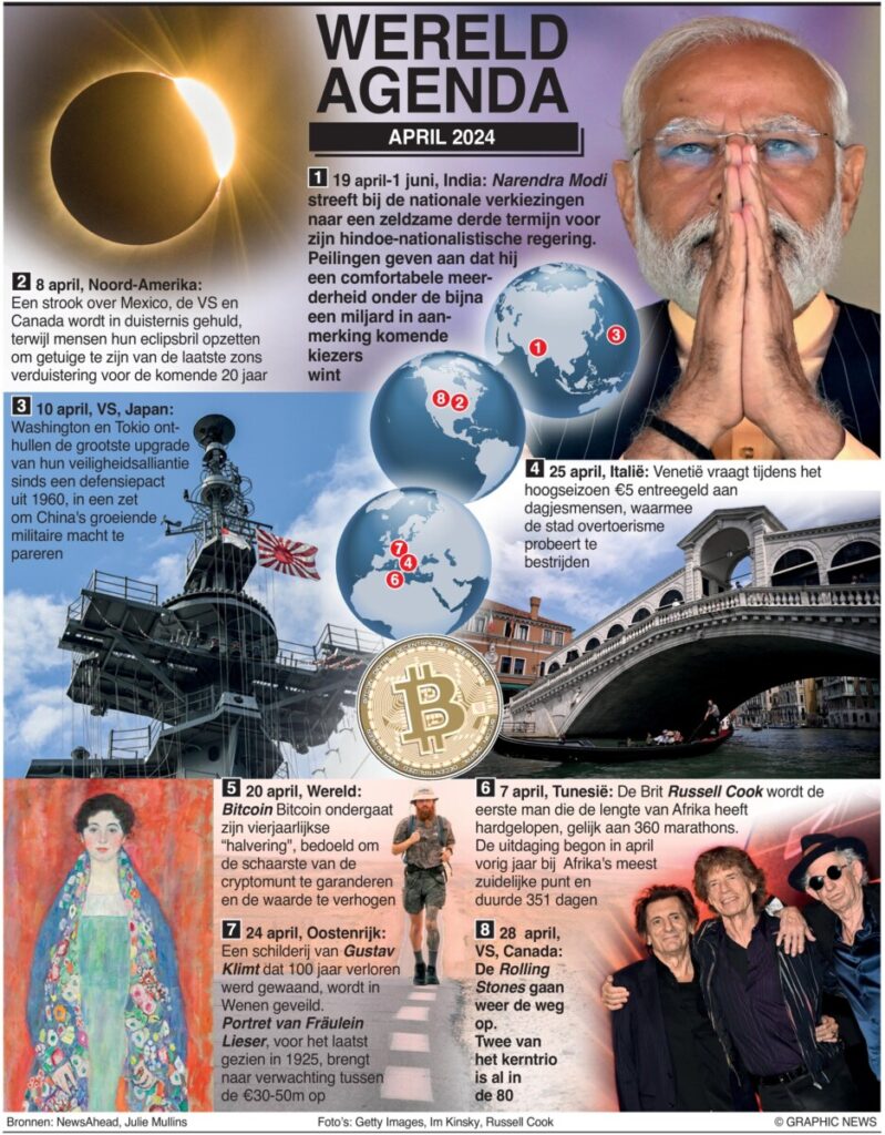 1 april 2024 – 30 april 2024 – Tot de gebeurtenissen in april behoren onder meer nationale verkiezingen in India, een totale zonsverduistering in Noord-Amerika, de upgrade van de veiligheidsalliantie tussen de VS en Japan, het opleggen van een vergoeding voor een bezoek aan Venetië, en Rolling Stones’ nieuwe tournee door de VS en Canada.