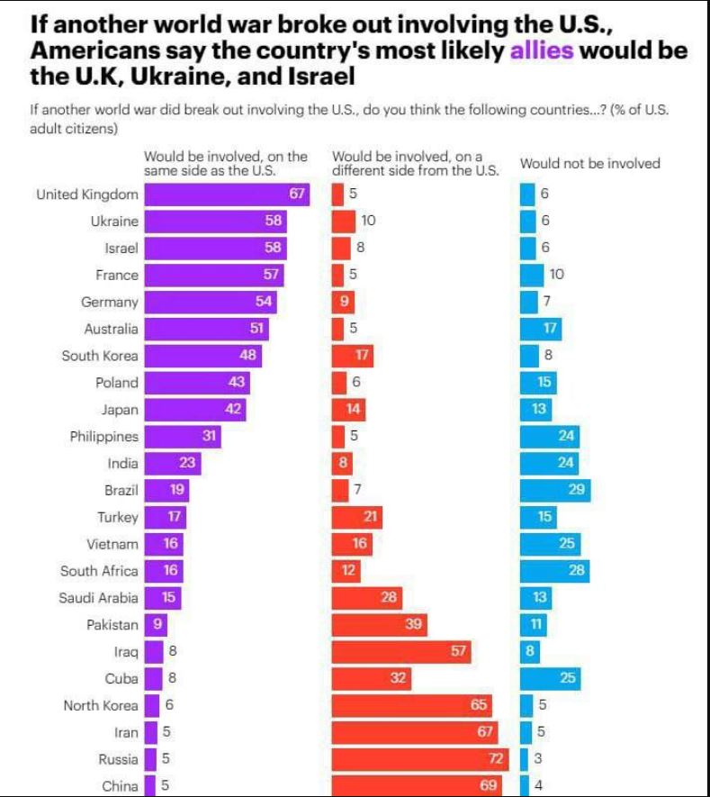 Amerikanen beschouwen Turkije als de meest onbetrouwbare bondgenoot in de NAVO, en Brazilië, Zuid-Afrika en Cuba zullen volgens de ondervraagden niet deelnemen aan het conflict.