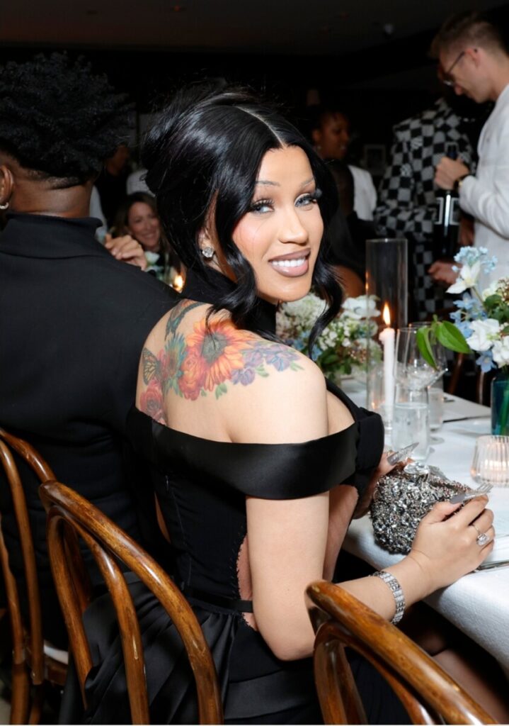 Vergezeld door haar stylist Kollin Carter woonde Cardi B het evenement bij in een zwarte midi-jurk van Nicolas Jebran met uitsnijdingen in het lijfje en een dijhoge split. Ze kleedde zich aan met transparante panty’s, pumps en een schitterende clutch. De rapper droeg haar donkere lokken in een opsteekkapsel, terwijl haar make-up bestond uit ijsblauwe contactlenzen, koraalblos en bruine lipliner.