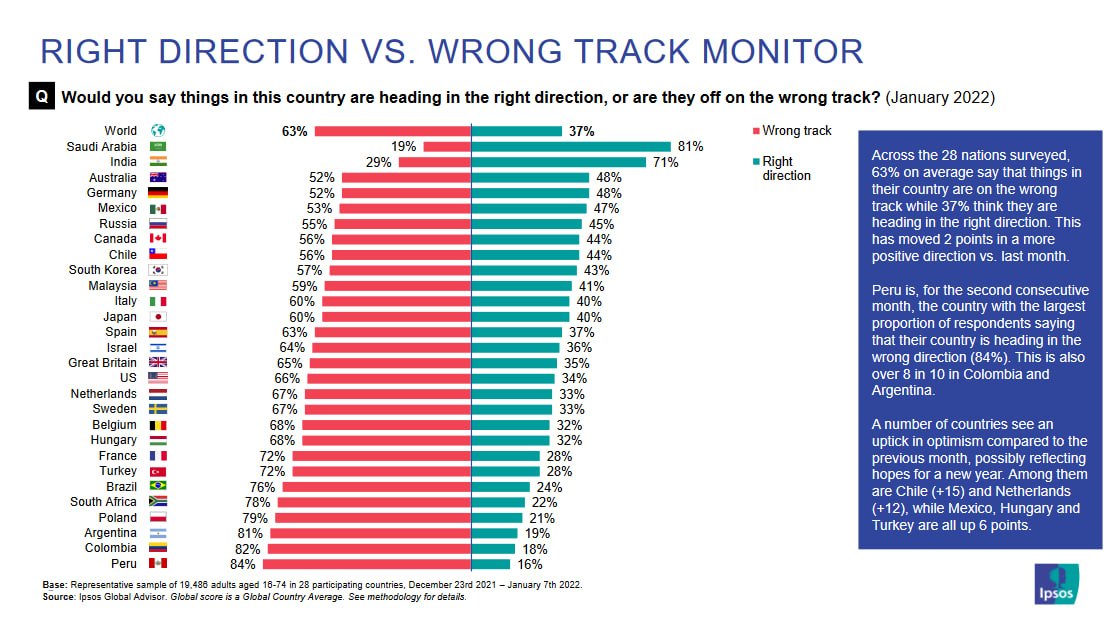 Het aandeel dat gelooft dat hun land de verkeerde kant op gaat, is de afgelopen twee jaar enorm gestegen: in Groot-Brittannië is het met 14 procent gestegen naar 79 procent, in Frankrijk met 10 procent naar 82 procent en in Duitsland met maar liefst 20 procent. tot 72 procent.