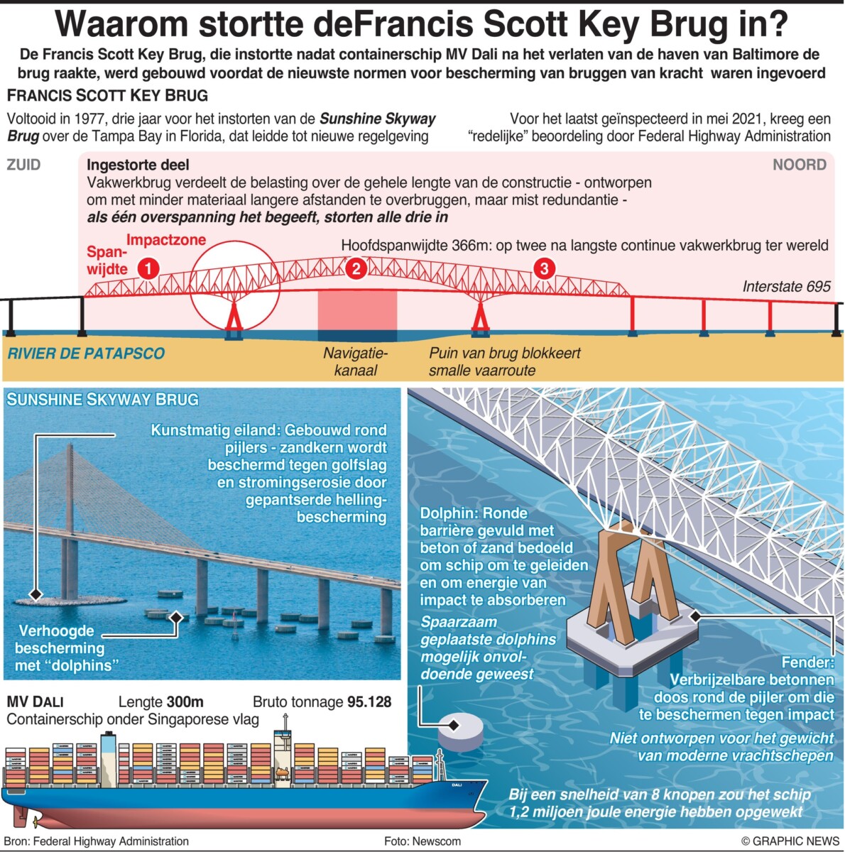 26 maart 2024 – De Francis Scott Key Bridge, die instortte nadat hij werd geraakt door het containerschip MV Dali toen het de haven van Baltimore verliet, werd gebouwd voordat de nieuwste normen voor brugbescherming van kracht waren.