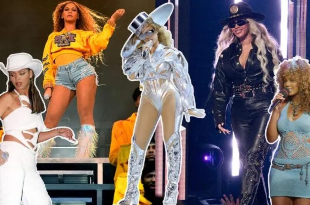 De âRenaissanceâ-tour was de show die qua mode bleef geven. Haar gepantserde korsetlook met galactische metallic laarzen en enorme hoed was een voorloper van haar futuristische kijk op cowboy. Dit is de definitie van een podiumoutfit.