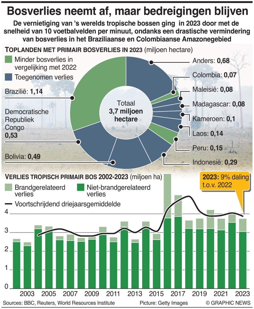 Maar onderzoekers van Global Forest Watch zeggen dat de vernietiging hardnekkig hoog blijft. Vorig jaar verloor de wereld ongeveer 37.000 vierkante kilometer tropisch oerbos, een gebied dat bijna net zo groot is als Zwitserland, aldus Reuters.